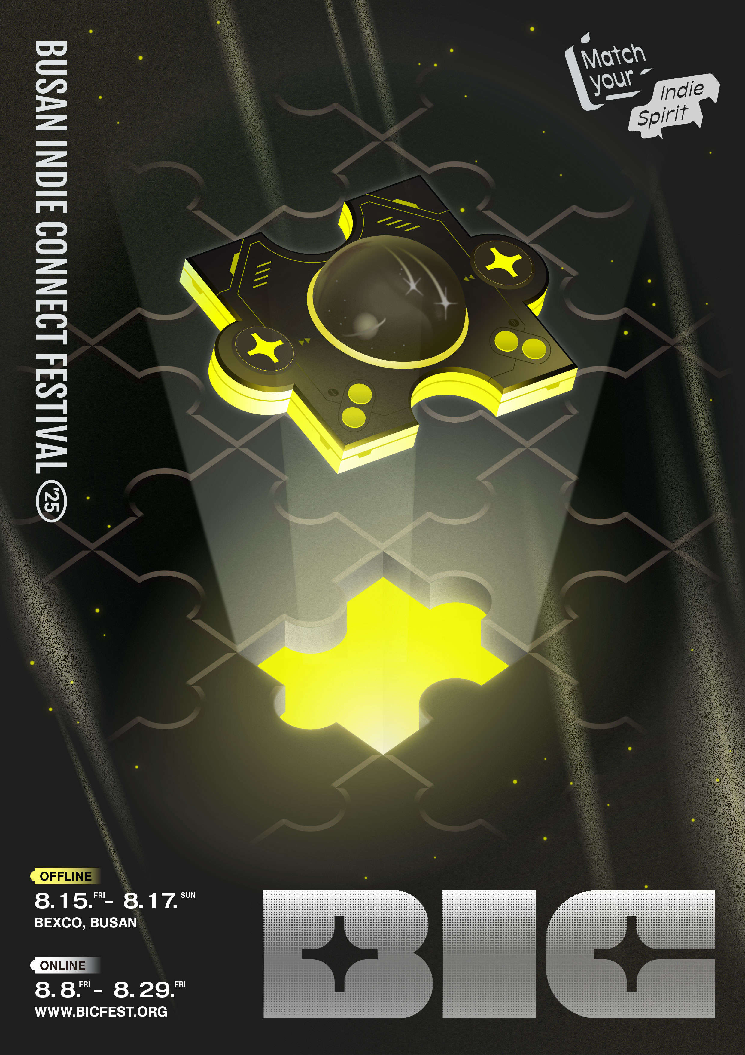 이번 BIC 2025의 키비주얼은 슬로건 ‘Match your Indie Spirit’ 아래, 인디게임과의 운명적인 연결을 직관적으로 표현했다. 퍼즐판 위에 서서히 자리 잡는 우주선 모양의 퍼즐 조각은 개발자와 게이머, 인디게임과 참관객이 서로를 향해 자연스럽게 이끌리는 ‘매칭의 순간’을 은유한다.