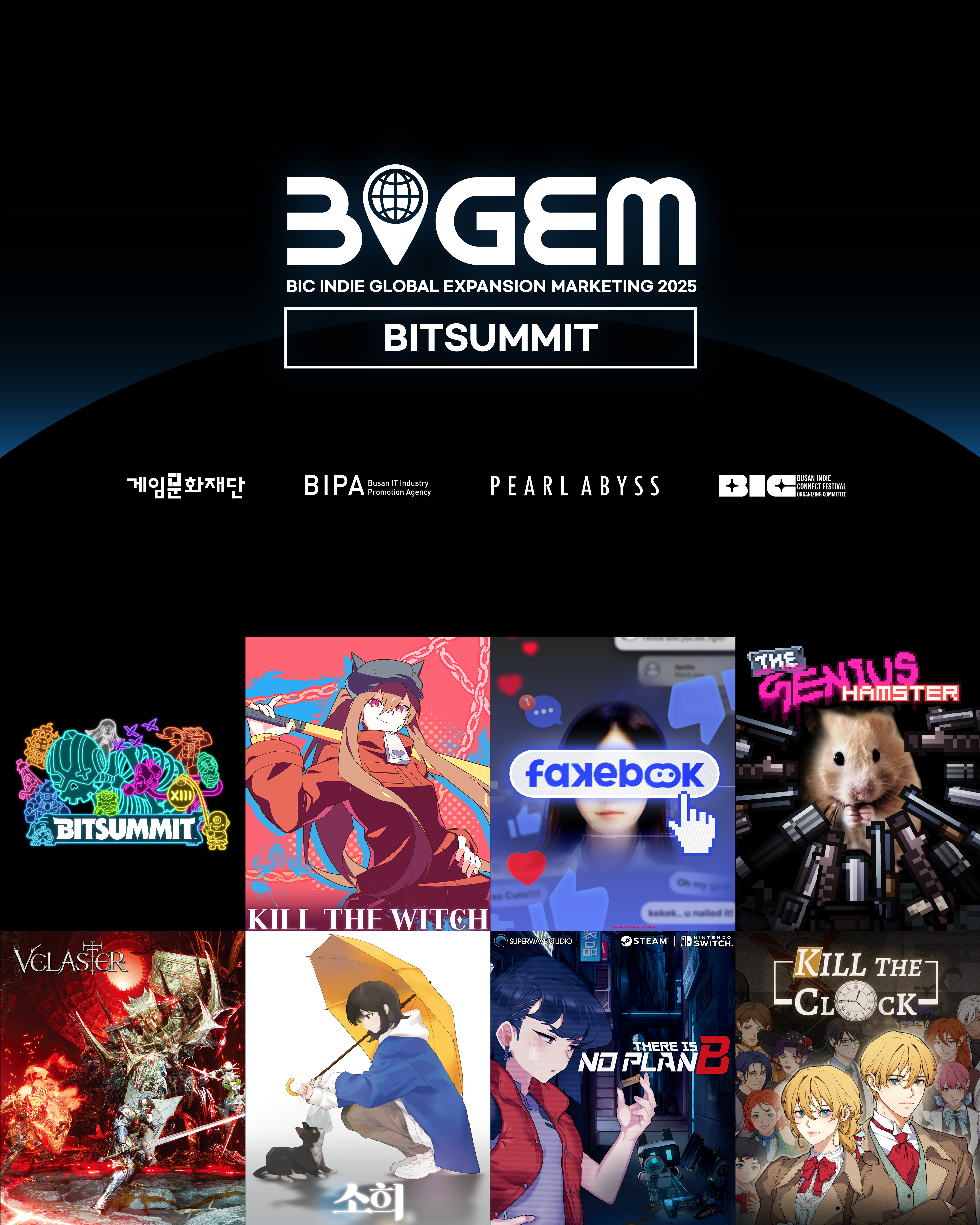 (재)게임문화재단(이사장 유병한), (재)부산정보산업진흥원(원장 김태열, 이하 BIPA), 펄어비스(대표 허진영), (사)부산인디커넥트페스티벌조직위원회(조직위원장 주성필, 이하 BIC 조직위)는 ‘BIGEM(BIC Indie Global Expansion Marketing, 이하 빅잼(BIGEM))’ 3기 선정작 7종의 일본 ‘비트서밋 2025(BitSummit 2025)’ 전시 참여를 지원한다고 밝혔다.