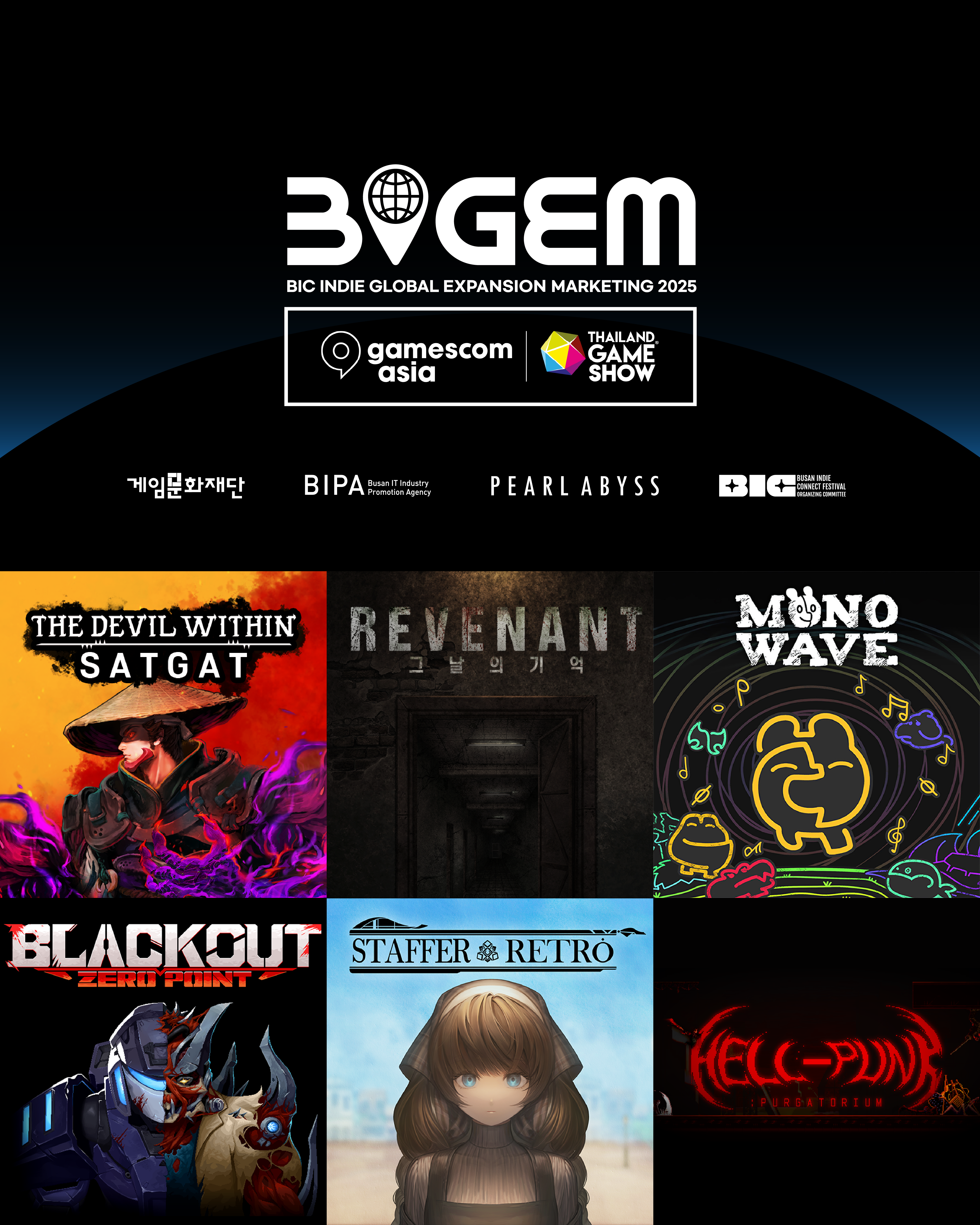 (재)게임문화재단(이사장 유병한), (재)부산정보산업진흥원(원장 김태열, 이하 BIPA), 펄어비스(대표 허진영), (사)부산인디커넥트페스티벌조직위원회(조직위원장 주성필, 이하 BIC 조직위)가 오는 ‘BIGEM(BIC Indie Global Expansion Marketing, 이하 빅잼)’ 사업에 선정된 국내 우수 인디게임의 ‘게임스컴 아시아 X 태국 게임쇼 2025’ 전시 참여를 전격 지원한다.