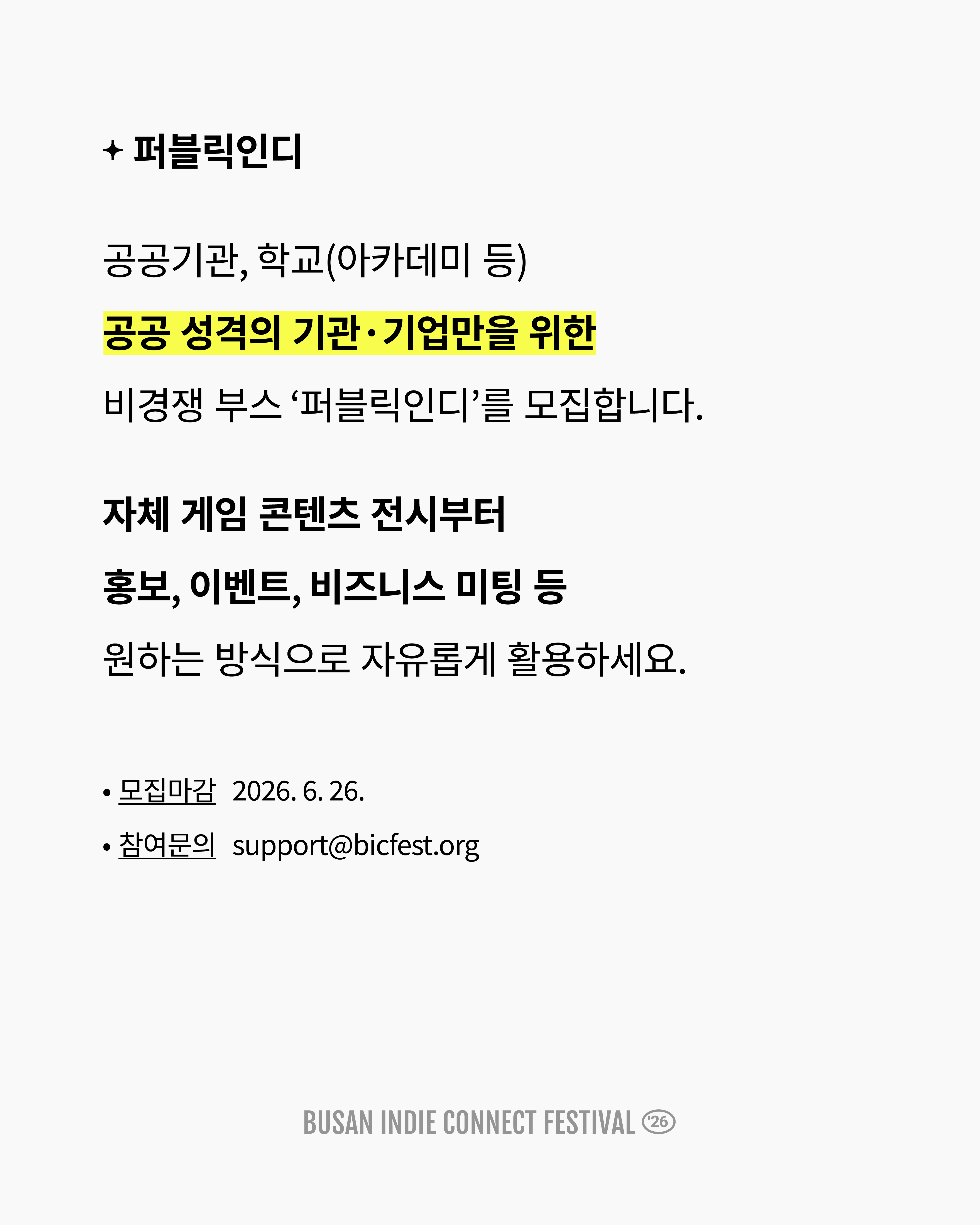 BIC Festival 2026 비경쟁부스-퍼블릭인디 신청은 아래 링크를 통해서 가능합니다.